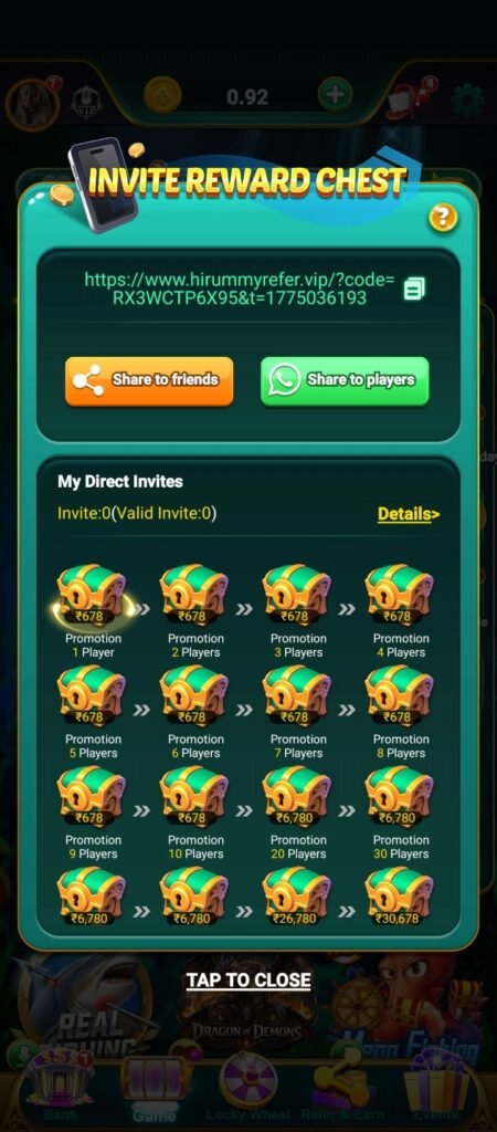 Rummy Hi App Me Refer करके पैसा कमाना काफी आसान है, बस इसके लिए Share पर क्लिक करना हैं, फिर आपके सामने Whatsapp/Facebook और Copy Link का ऑप्शन आएगा। जिस पर क्लिक करके अपने किसी दोस्त को शेयर कर पैसे कमा सकते है।